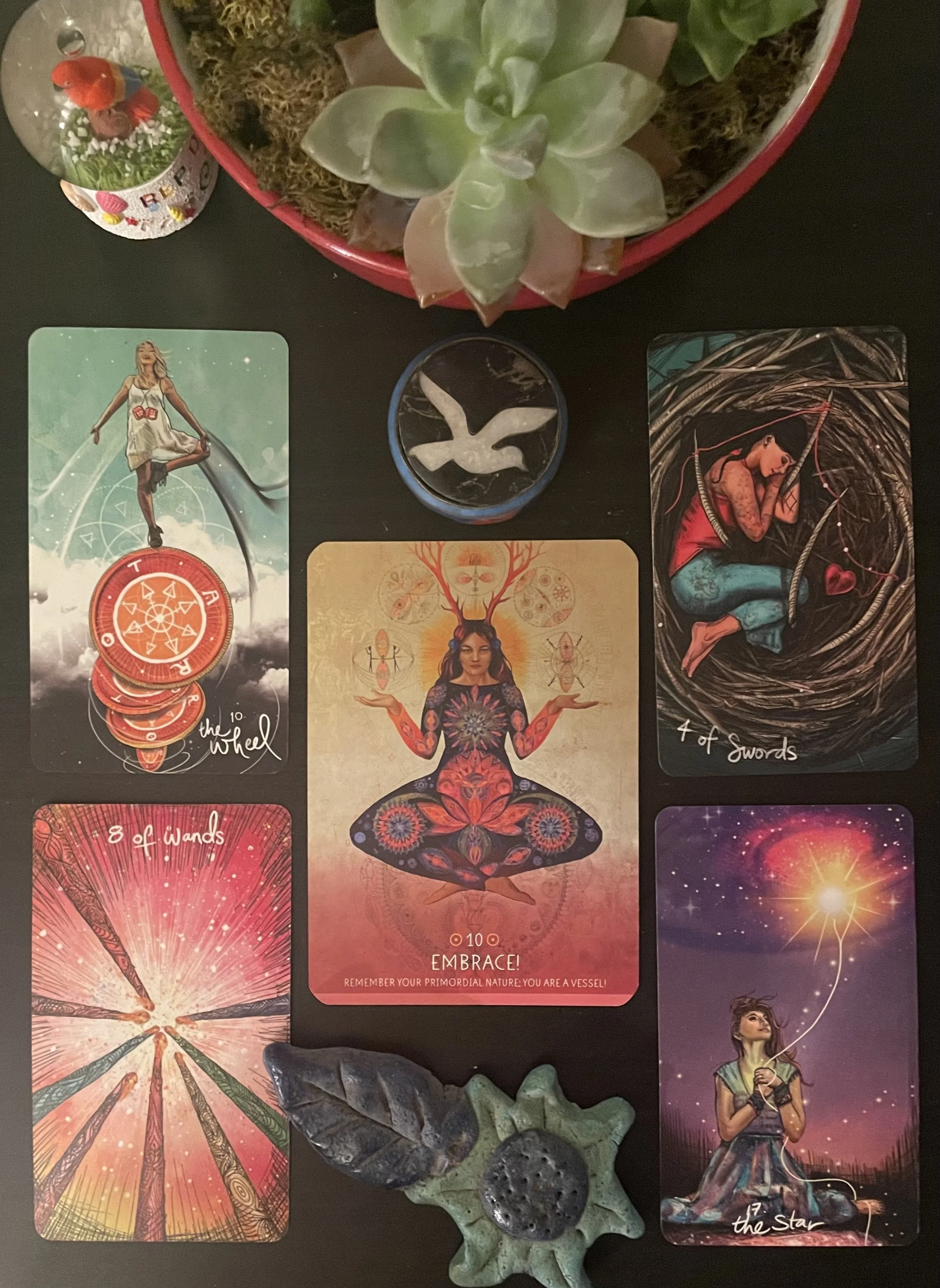 Embrace = Lastly, I pulled a card from the Medicine Woman Oracle deck and this reaffirms the go with the flow. As much it is about taking action, it is also about receptivity. Allowing and not forcing things. Let go of the struggle and surrender to receiving what you need from the divine and not necessarily what you want. Life will be presenting you with opportunities and gifts in different forms which might not fit what you had envisioned but nevertheless embrace the idea that you are being offered exactly what is required now for you to grow and expand. Slow down enough to find things to be grateful for throughout this cycle. Blessings to you!